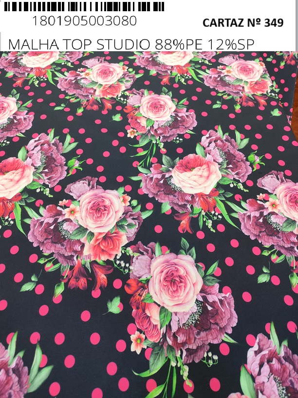 Estampa: Fundo preto com poás (bolinhas) cor-de-rosa e grandes buquês florais em tons de rosa, lilás e vermelho, com detalhes verdes.
