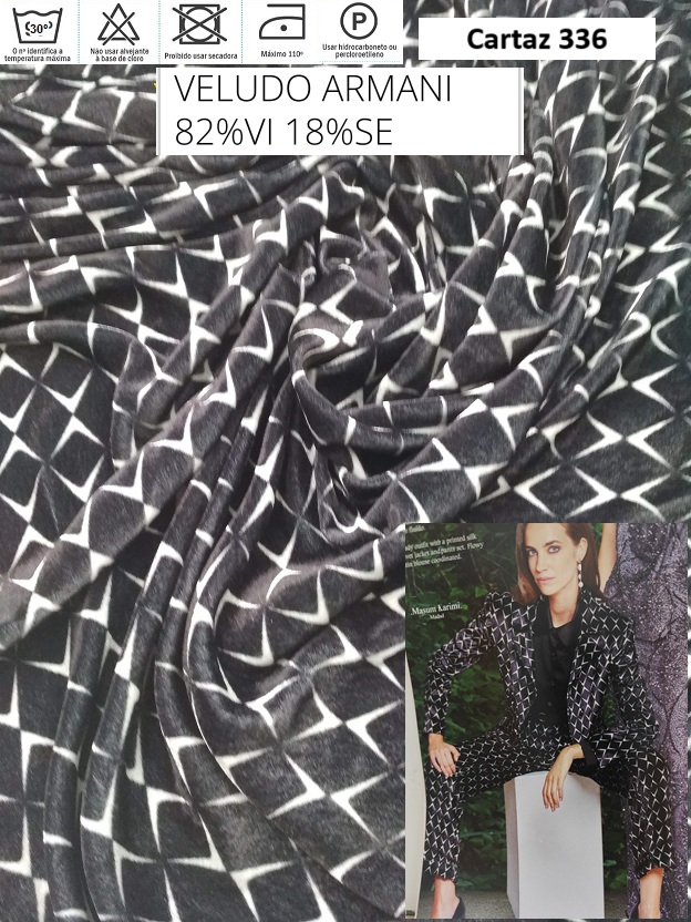 Veludo Armani é um tecido luxuoso e macio, com toque sedoso e ligeiro brilho característico. A viscose confere conforto e caimento fluido, enquanto a seda acrescenta elegância e suavidade extra.