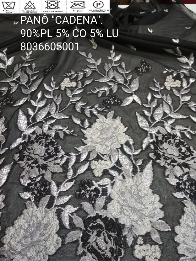 Tecido em Guipur para a Elegância de um Vestido de Festa, com a particularidade á colocação de base em qualquer cor, dando o requinte sofisticado